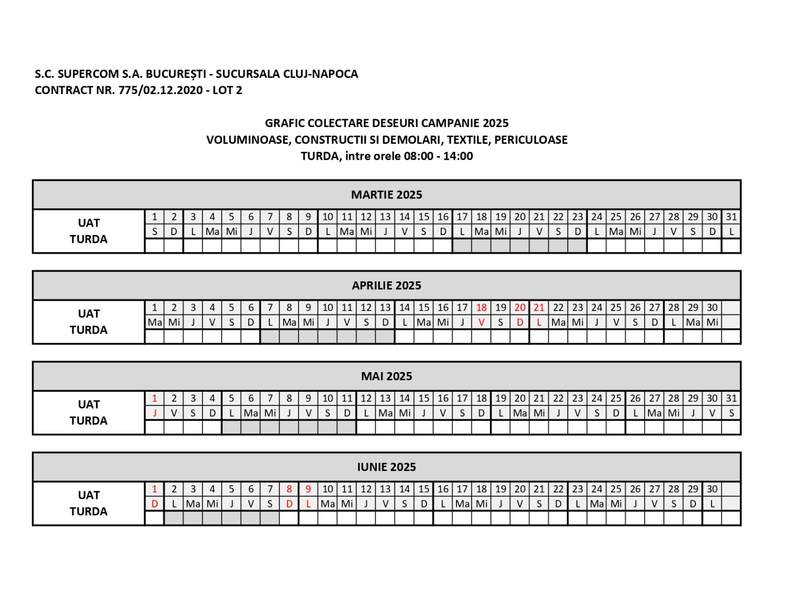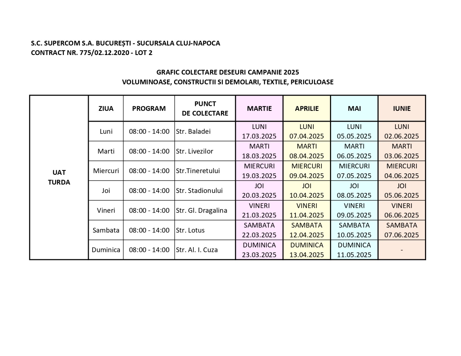 Programul de colectare a deșeurilor voluminoase, textile, periculoase și a celor provenite din amenajări interioare/exterioare a suferit modificări, după cum este precizat în imaginea atașată, pentru perioada martie-iunie 2025.
