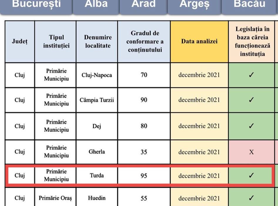 În urma aceste monitorizări, municipiul Turda, are un grad de conformare a respectării conținutului legii în procent de 95%, fiind locul 1 pe județ la nivel de municipii!